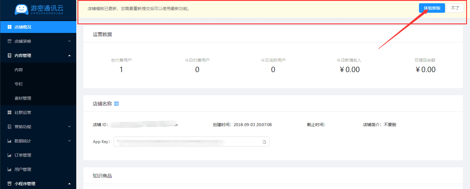 当您进入小程序概况页面时,顶部出现如下小黄条,说明游密通更新了新的产品功能,您可以更新到新版本体验,点击体验新版。