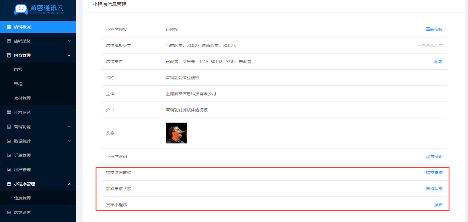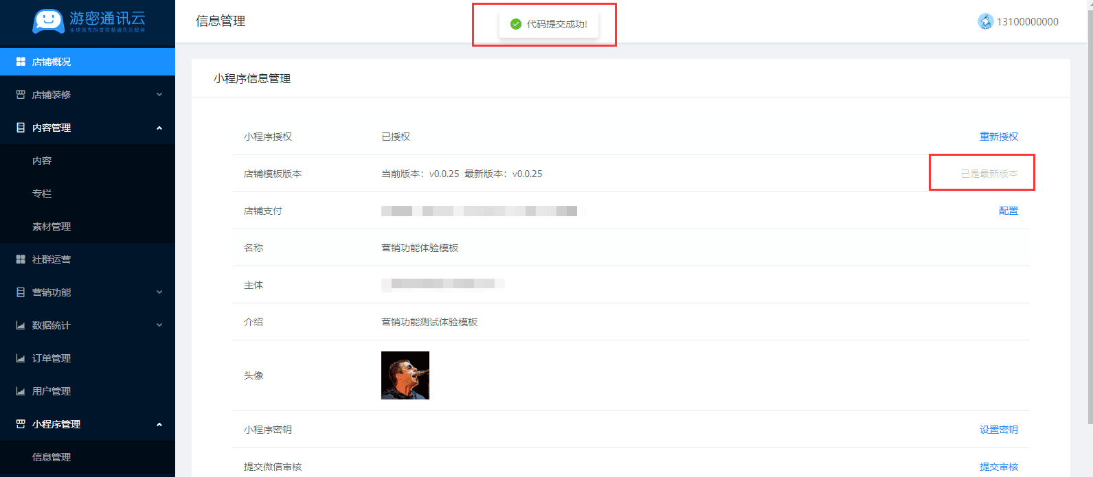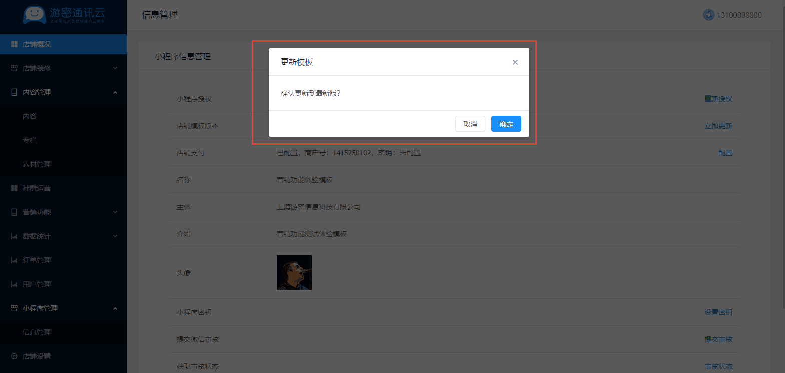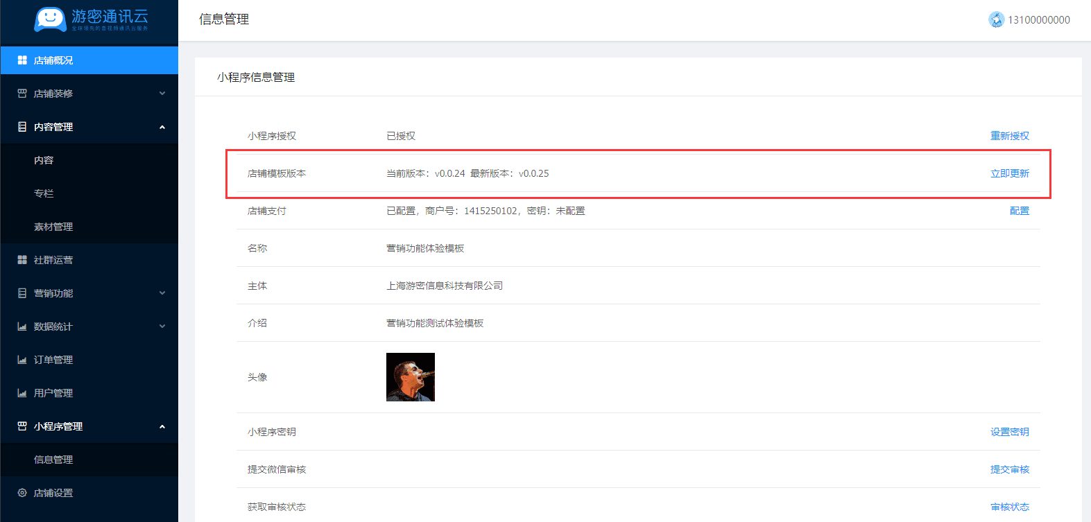 点击后,进入小程序信息管理页面。请注意版本字段,该字段会展示当前您使用的版本号和最新的版本号,若您当前的版本号小于最新版本号,说明您使用的不是最新版本,建议您点击立即更新按钮进行更新。