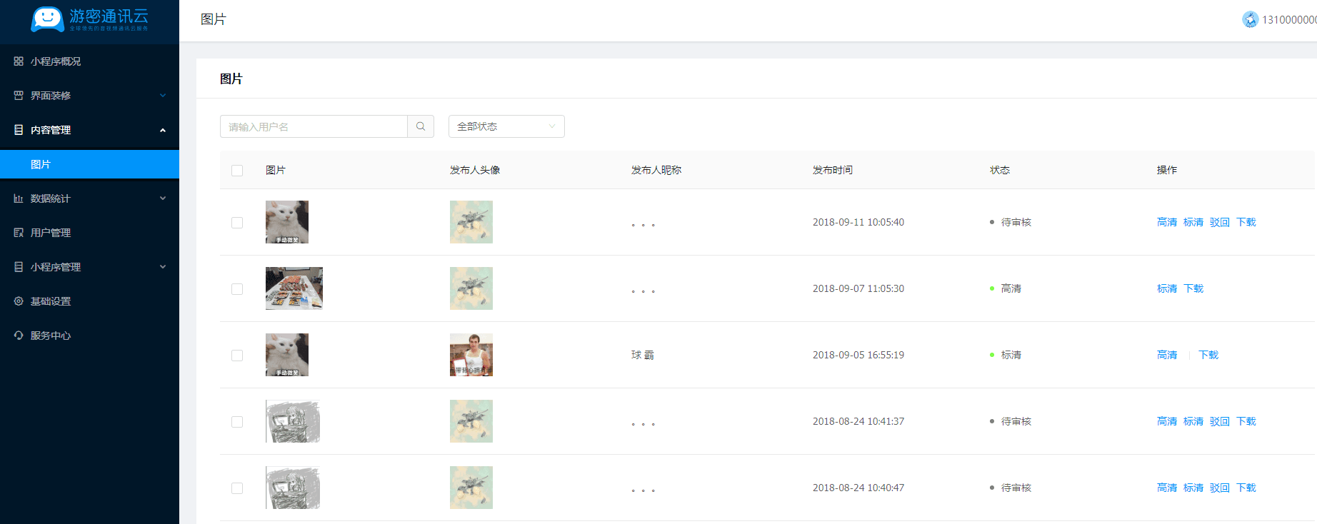 点击左侧菜单中的内容管理页面,进入内容-图片页面,该列表展示所有用户从小程序端上传的图片。