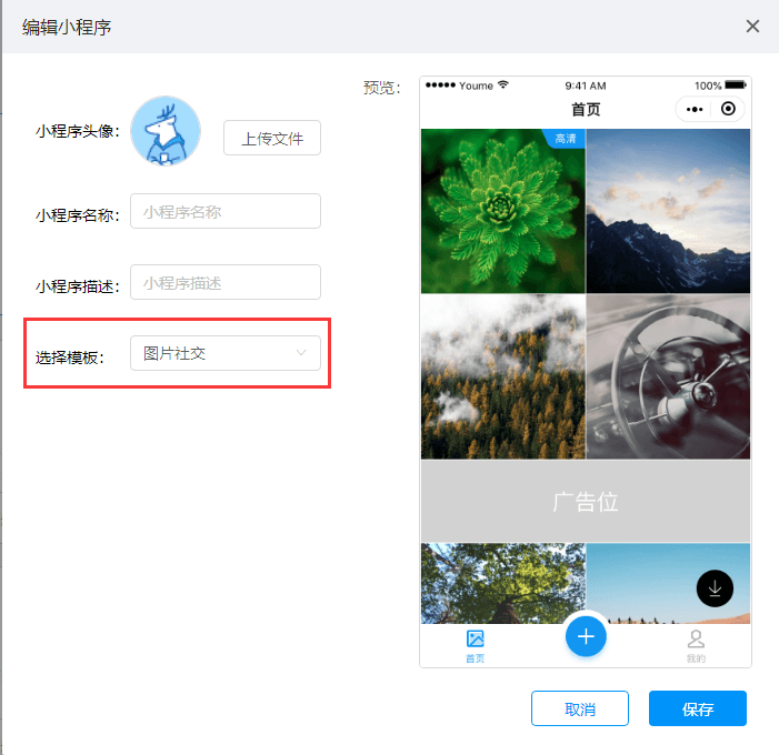 首先您需要在游密通后台:http://xcxconsole.youme.im ,新增一个模板为图片社交的小程序。