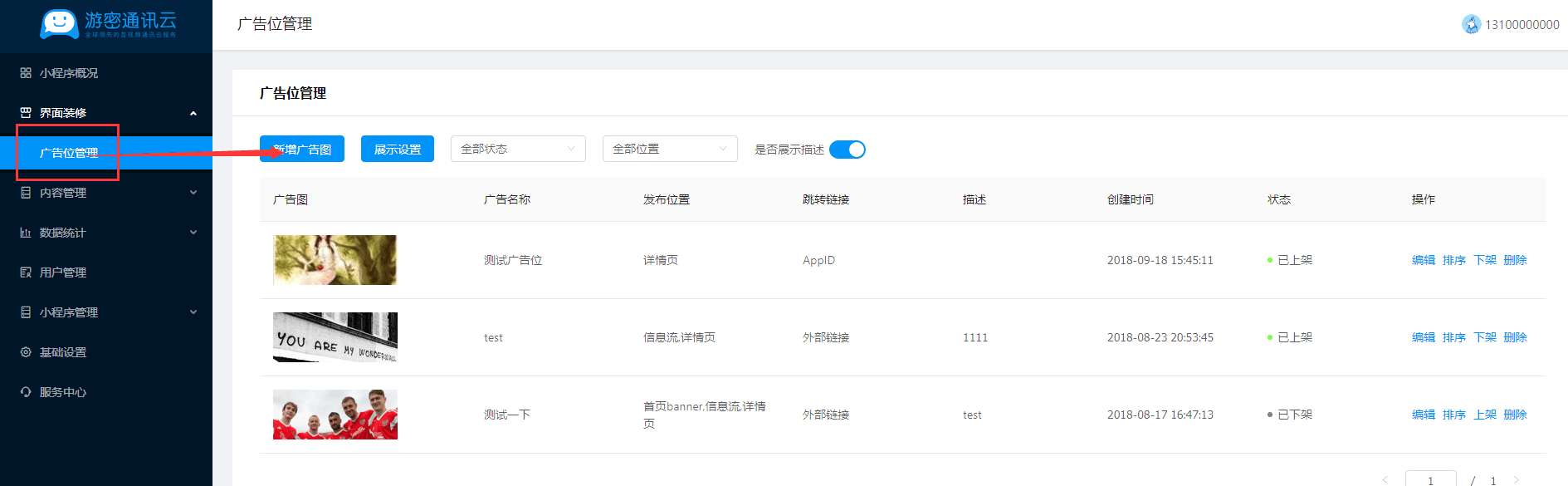 店铺装修-广告位管理页面,点击新增广告图。