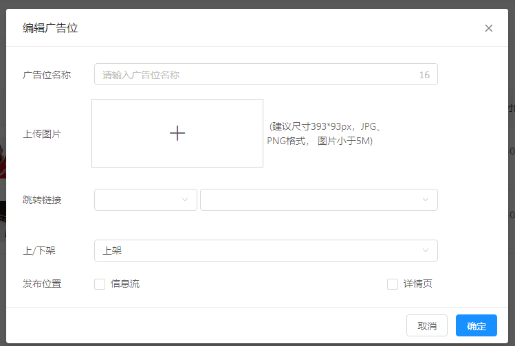依次填写弹窗中的字段,所有字段均为必填。 选择发布位置时,信息流含义为只展示在图片列表中,详情页含义为展示在图片详情页底部。