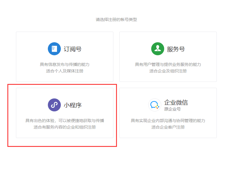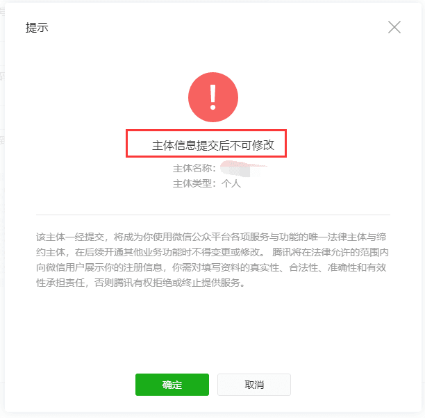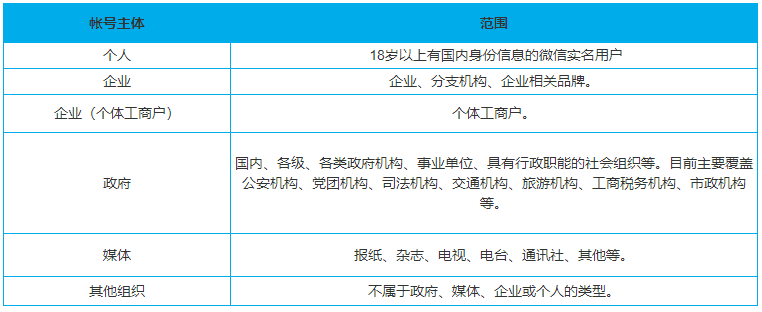 主体类型说明(图片来自于微信) 注意:若您需要开通微信支付,小程序主体不得为个人,微信规定主体为个人的小程序无法开通微信支付。