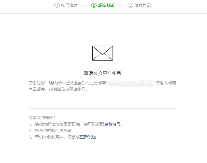注册后,该邮箱会收到微信公众平台的激活邮件,需要激活该账号后再进行下一步操作。