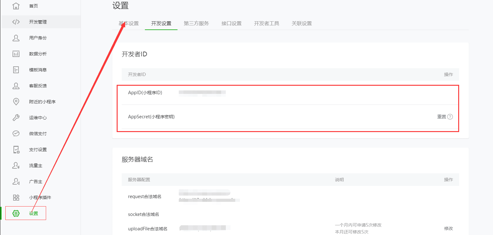 登录微信公众平台:https://mp.weixin.qq.com , 点击左侧菜单中设置页面。进入设置页后,开发者ID模块中的AppID即为小程序ID,AppSecret即为小程序密钥,请注意该参数的安全性和保密。