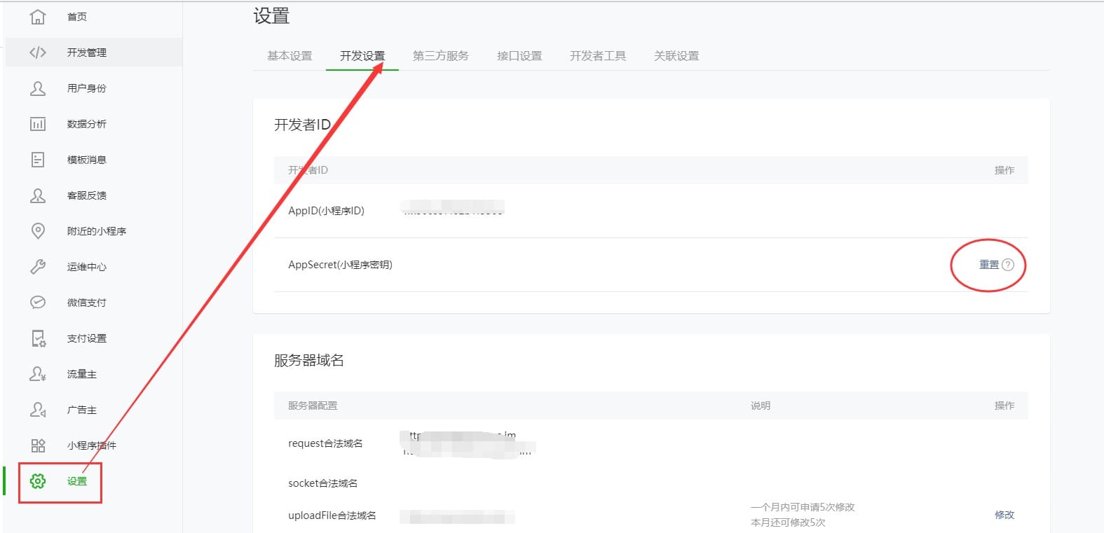 登录微信公众平台:https://mp.weixin.qq.com/ ,在左侧菜单中选择设置,进入开发设置页面。点击小程序密钥字段后的重置按钮。