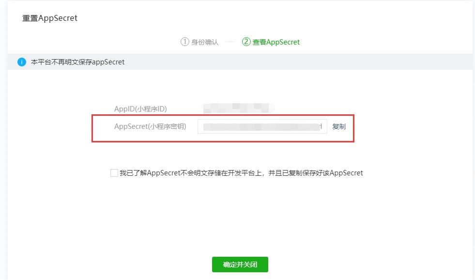 扫码确认身份信息后,进入查看appsecret页面,复制页面中展示的小程序密钥。