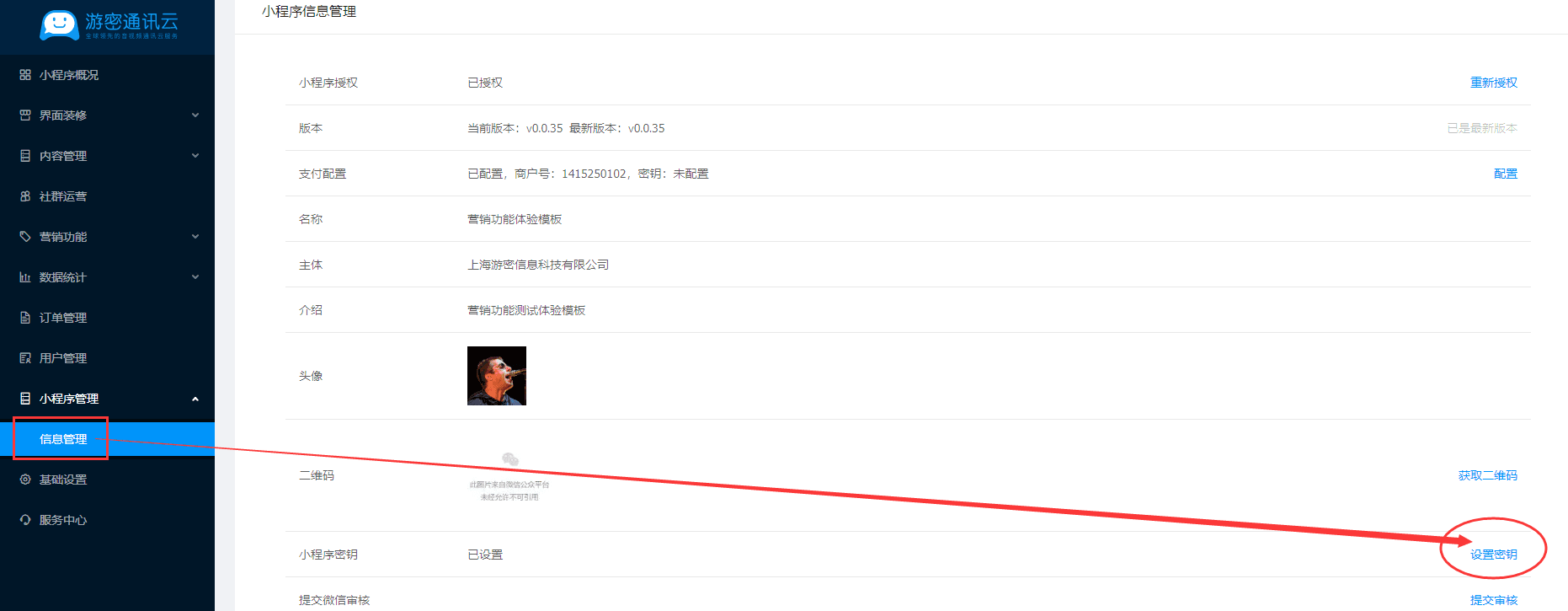 进入游密通-小程序管理-信息管理页面,点击小程序密钥字段的设置密钥按钮。