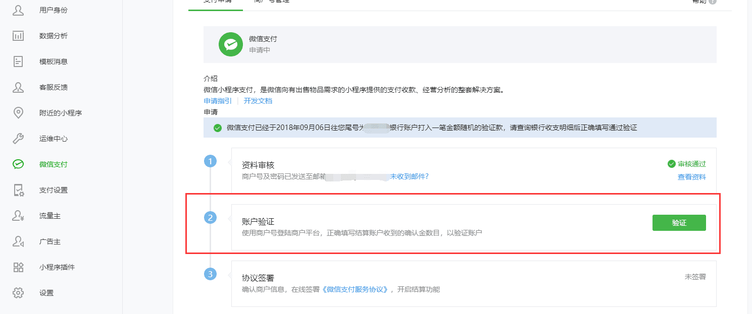 微信认证通过后,需要进行下一步操作。微信支付平台会给您的邮箱发送通过微信支付商户资料审核的邮件和向您的银行账户随机打一笔验证款。 您需要登录微信支付商户平台:https://pay.weixin.qq.com 进行验证。