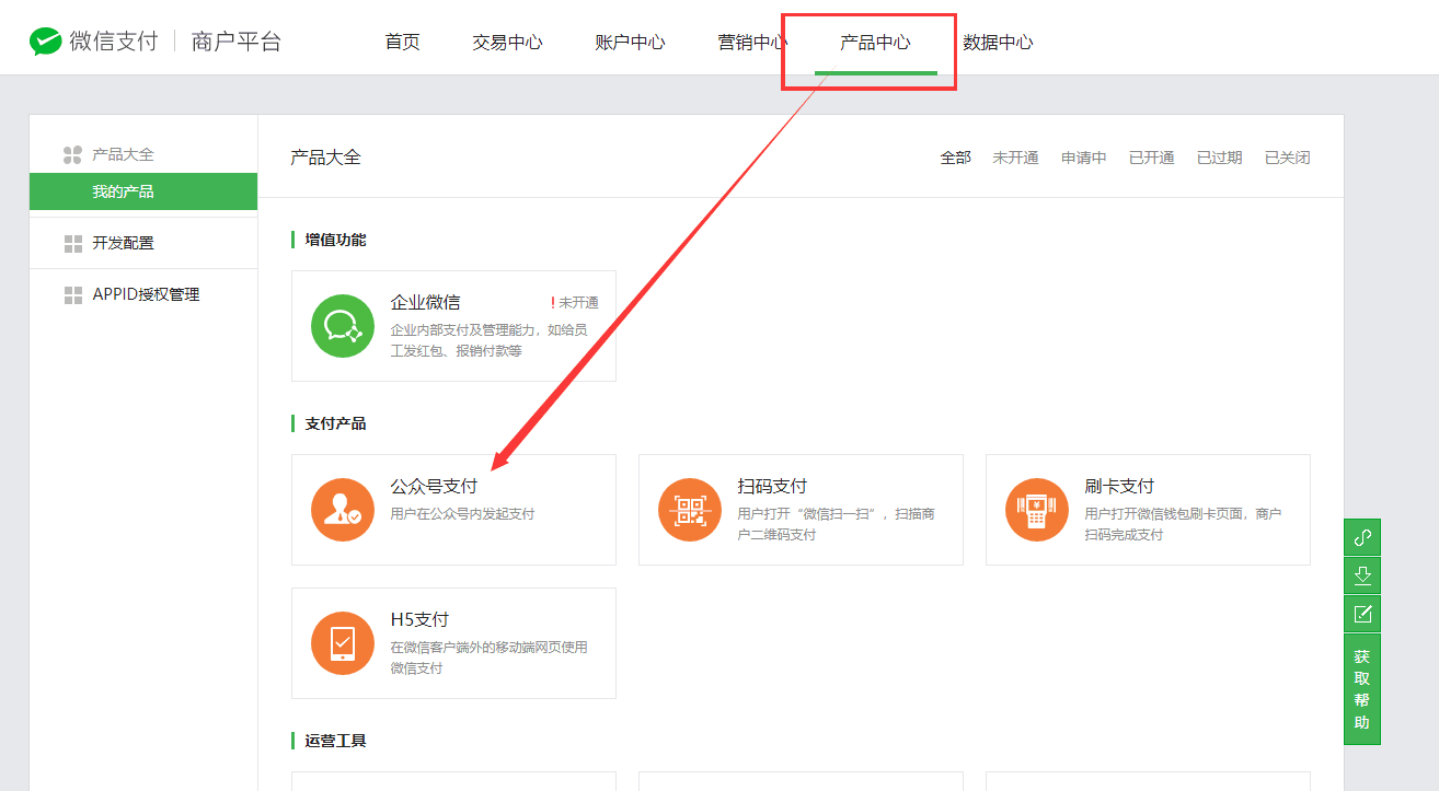 登录微信支付商户平台:https://pay.weixin.qq.com ,选择产品中心-公众号支付。